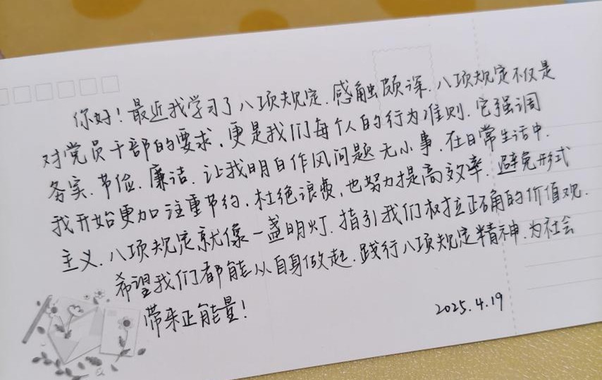 活动结束后评选出前4名小组并为小组成员颁发了奖品。这些奖品简约而富有深意,既是对同学们活动佳绩的认可,也寄托了对大家未来在学习生活中持续弘扬党建精神、保持昂扬斗志的殷切期望。同时所有参与活动的同学们还随机抽取了写有别的同学寄语的明信片作为纪念。这促进了同学间的情感交流,契合中央八项规定精神,彰显了勤俭节约、密切联系群众的作风,传递了团结友爱的正能量,彰显了党建引领下集体的强大凝聚力。参与活动的同学们纷纷表示收获颇丰。有同学感慨道:“这次活动让我深刻体会团队协作的力量。以后我会继续以实际行动践行党的要求,为党和国家贡献自己的一份力量。”
