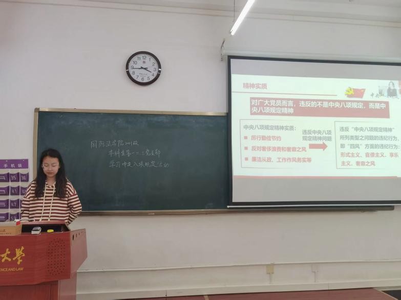 随后,2021级本科生第三党支部书记李依润带来了别开生面的典型案例讲解。正面案例生动展现了党员干部严守八项规定、廉洁自律、全心全意为人民服务的良好形象,为在场党员树立了学习的榜样;反面案例则深刻剖析了违规违纪的严重后果,为全体党员敲响了纪律警钟,提醒大家时刻绷紧纪律这根弦。