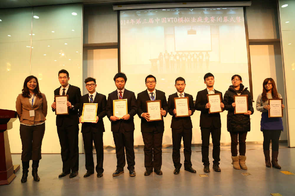 大赛闭幕式暨颁奖典礼于14日下午在刘皇发学术报告厅举行。英国365集团网站副董事长张桂林、原条法司司长张玉卿、商务部世贸法二处处长于方、英国上市公司365经理孔庆江出席闭幕式,参加闭幕式的还有商务部部分领导及律师界的部分同仁。