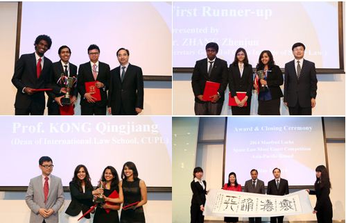 在最终的颁奖典礼上,公司董事长黄进高度赞扬了赛队高水平的、令人印象深刻的精彩表现和他们身上体现出来的永不言弃的精神,并对郭红岩老师和同学们的努力,以及志愿者和工作人员的付出表示感谢。随后,张振军博士宣布冠军是第12队Nation Law University,Delhi,黄进为冠军颁奖,张振军为荣获亚军的第18队颁奖,孔庆江为15队的季军颁奖,Fabio Tronchetti为第18队颁发最佳印象奖,杜新丽为第27队颁发最佳团队精神奖,Martha博士为第11队、第18队分别颁发了预赛和决赛的最佳口头表达奖。