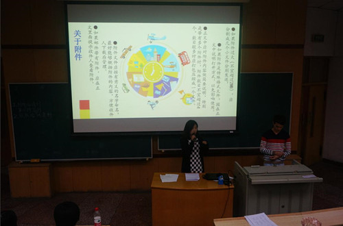 接下来是办公室张译文同学介绍举办大型活动过程中应注意的礼仪。联系嘉宾和会场礼仪的介绍分为普通事例与特别注意事项,这种方式明确了讲解的重点。其中穿插的情景剧寓教于乐,让同学们在欢笑中了解了礼仪细节。最后张译文同学总结注意事项为“得体、大方、尽职、灵活”四个词,方便了同学们记忆。