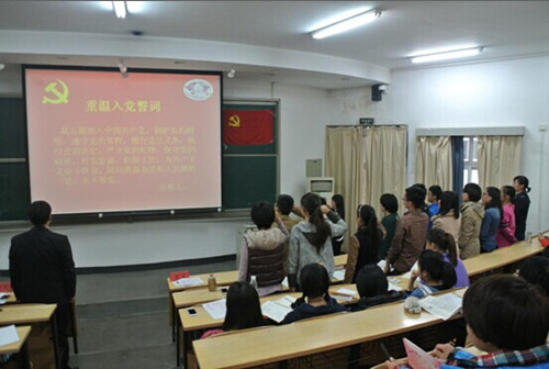 最后沙钰同学带领新生党员重温了入党誓词:我志愿加入中国共产党,拥护党的纲领,遵守党的章程,履行党员义务,执行党的决定,严守党的纪律,保守党的秘密,对党忠诚,积极工作,为共产主义奋斗终身,随时准备为党和人民牺牲一切,永不叛党。