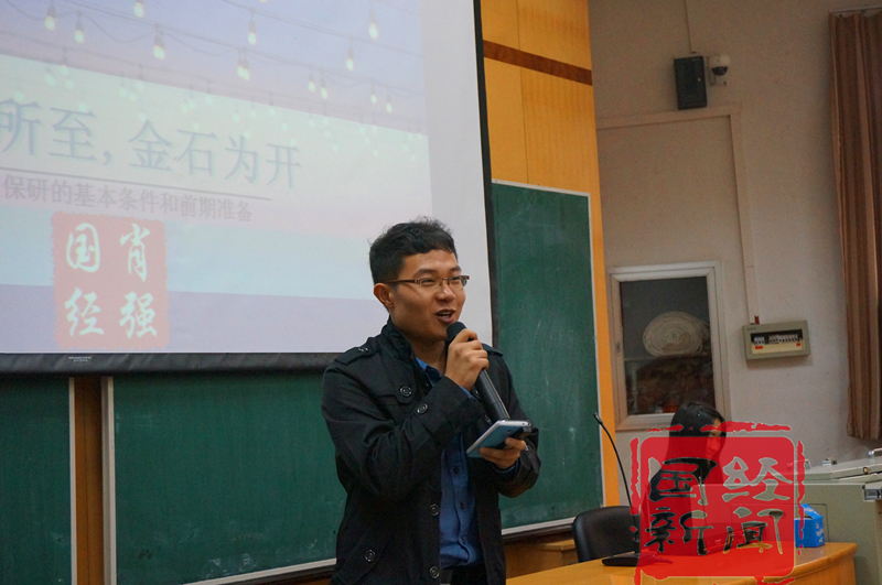 第一个进行交流讲解的是肖强同学。他以“精诚所至,金石为开”为题,向在座同学讲解了推免保研的政策,加分和分期准备,并穿插介绍了本科课程的属性和意义。他简短而全面的发言为大家揭开了保研的神秘面纱,提供了中肯可行的建议。他的发言博得了台下同学的热烈掌声。