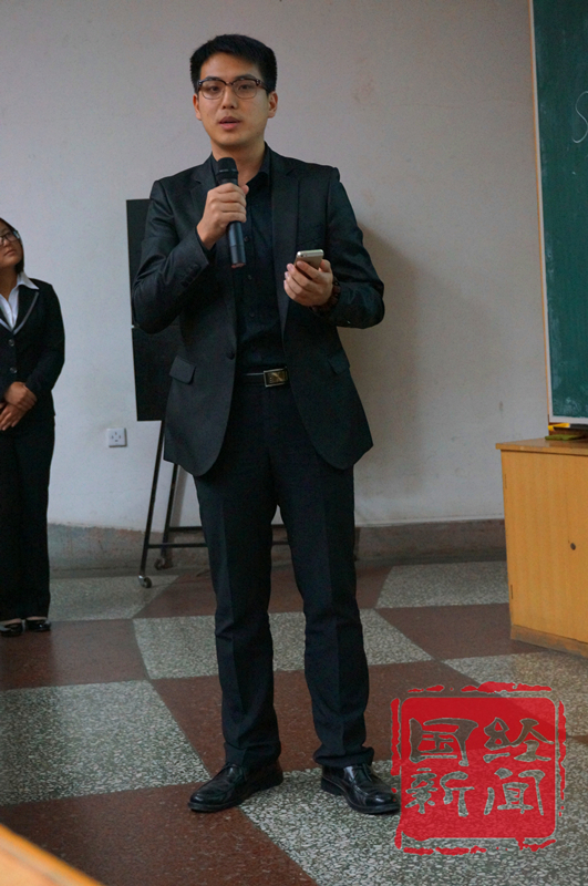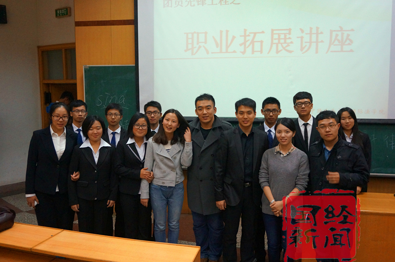 作为优秀青年律师的陈熙同学最后发言。他首先劝诫大家要选择正确的道路,而后结合实例,中肯地反思现阶段学习、生活和工作中的种种不足。他的剖析得到了大家的充分肯定,教室里不时响起阵阵掌声。
